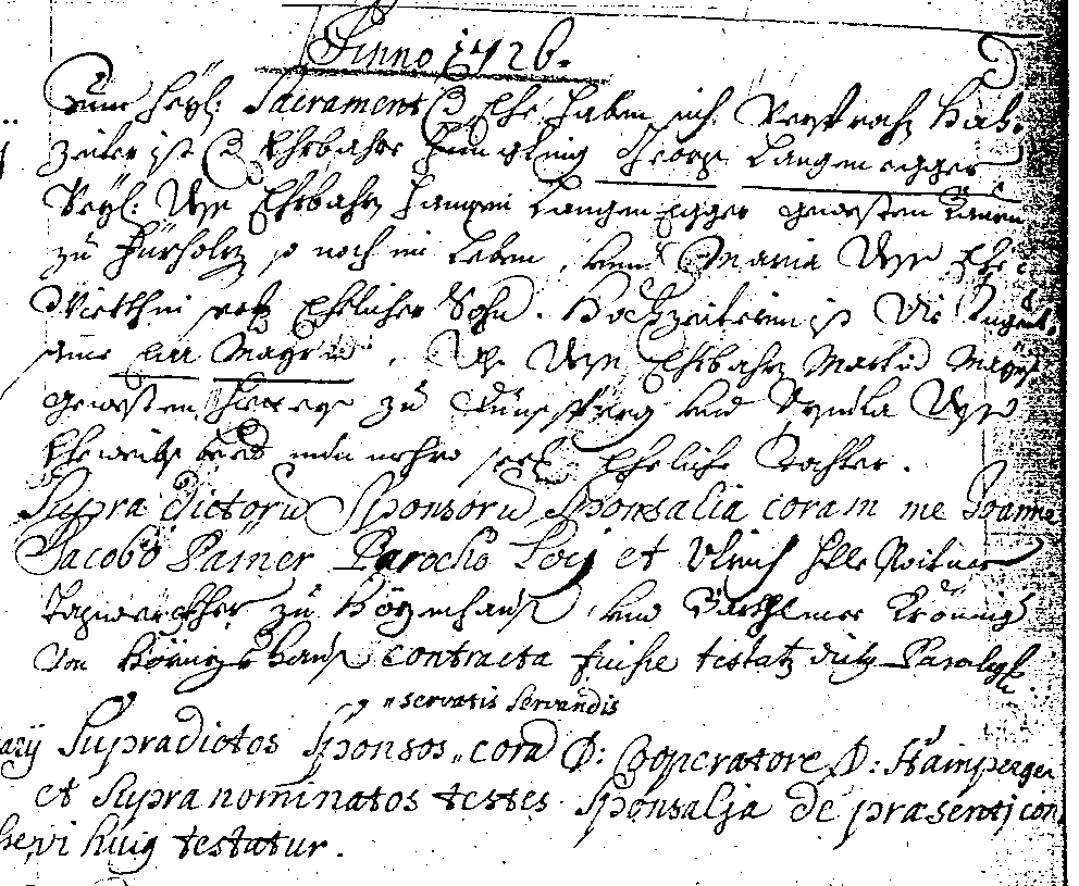 Supra dictorum sponsorum sponsalia coram me Joanne Jacobo Pämer parocho loci et Ulrich Hillerpoitner Tagwerckher zu Hözenhausen und Barthlmee Kröninger von Hörnzshausen contracta fuisse testatur dictus parochus ...