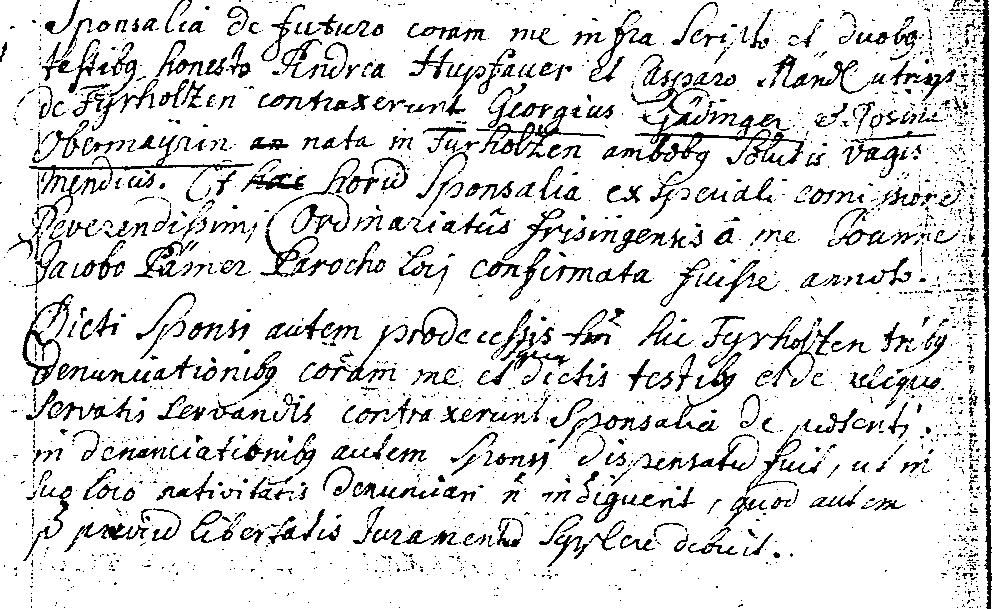 Sponsalia de futuro coram me infra scripto et duobus testibus honesto Andrea Hupfauer et Casparo Mändl utrisque de Fyrholzen contraxerunt Georgius Gädinger et Rosina Obermayrin nata in Fürholzen amborum solutis vagis mendicis. Et horum sponsalia ex speciali commisione et Reverendissimi Ordinariatus Frisingensis a me Joanne Jacobo Pämer parocho loci confirmata fuisse annoto.