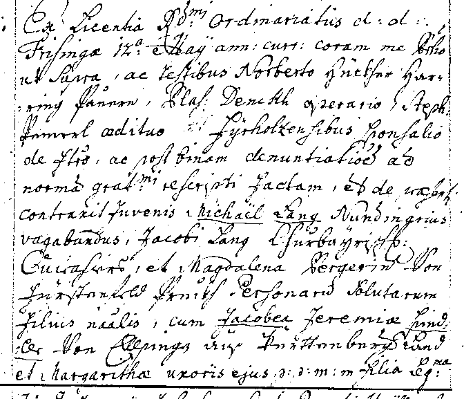 Mit Erlaubnis des hochwürdigsten Ordinariates vom Datum Freising 12. Mai laufenden Jahres wurde das Verlöbnis vor mir Pfarrer, wie oben angeführt, und (noch dazu) den Zeugen Norbert Hückher, Harring Pauer, (Ni)Clas Denckh, Tagwerker, Stephan Pemerl, Mesner von Fürholzen und nach zweimaliger Verkündigung nach der Vorschrift äußerst gnädig vollzogen und vor den Anwesenden hat die Ehe geschlossen der Jüngling Michael Lang, umherziehender Händler, Sohn des Jacob Lang, Churbayrischer Cürrasier und Magdalena Perger von Fürstenfeld Bruck, ledige Personen, deren natürlicher Sohn, mit Jabobäa des Jeremias Spindler von Ellpingen aus Württemberger Land und Margaritha seiner Frau, beide verstorben, legitime Tochter.