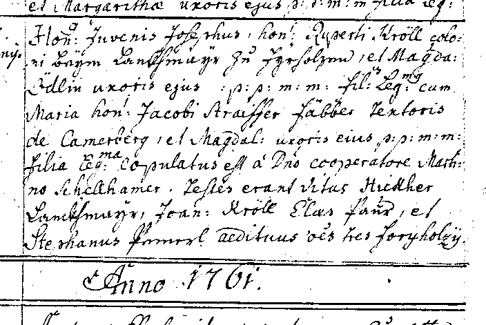 Hon(est)us juvenis Josephus hon(est)i Ruperti Kröll coloni beym Lankhmayr zu Fyrholzen et Magdalenae Ödlin uxoris eius p.p.m.m. fil(iu)s leg(iti)mus cum Maria hon(est)i Jacobi Straiffer fabber textoris de Camerberg et Magdal(ena) uxoris eius p.p.m.m. filia leg(iti)ma copulatus est a D(omi)no coopertore Martino Schellhamer. Testes erant Vitus Hickher Lankhmayr, Joan(nes) Kröll Clas Paur et Stephanus Pemerl aedituus o(mn)es tres Foryholzii.
