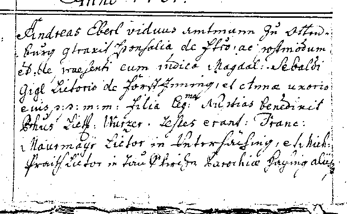 Andreas Eberl viduus Amtmann zu Ottenburg contraxit sponsalia de f(u)t(u)ro ac postmodum et(iam) de praesenti cum pudica Magdal(ena) Sebaldi Gigl lictoris de Forst Inning et Annae uxoris eius p.p.m.m. filia leg(it)ima. Nuptias benedixit P(aro)chus Lic(en)tiat Wurzer. Testes erant: Franciscus Maurmayr lictor in Unterhäching et Michael Praith lictor in Taufkirchen, parochiae Haching aliisque